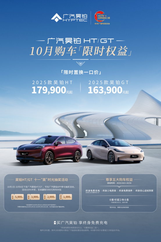 在新能源补贴逐步退坡的背景下,昊铂仍为用户带来诚意十足的购车政策。10月期间订购昊铂HT/GT,可享五大购车权益:终身免费充电或最高10000元置换补贴、终身三电质保、终身免费保养、终身安心送桩到家,以及0首付起、2年0利息”的金融方案,全面覆盖购车与用车环节。